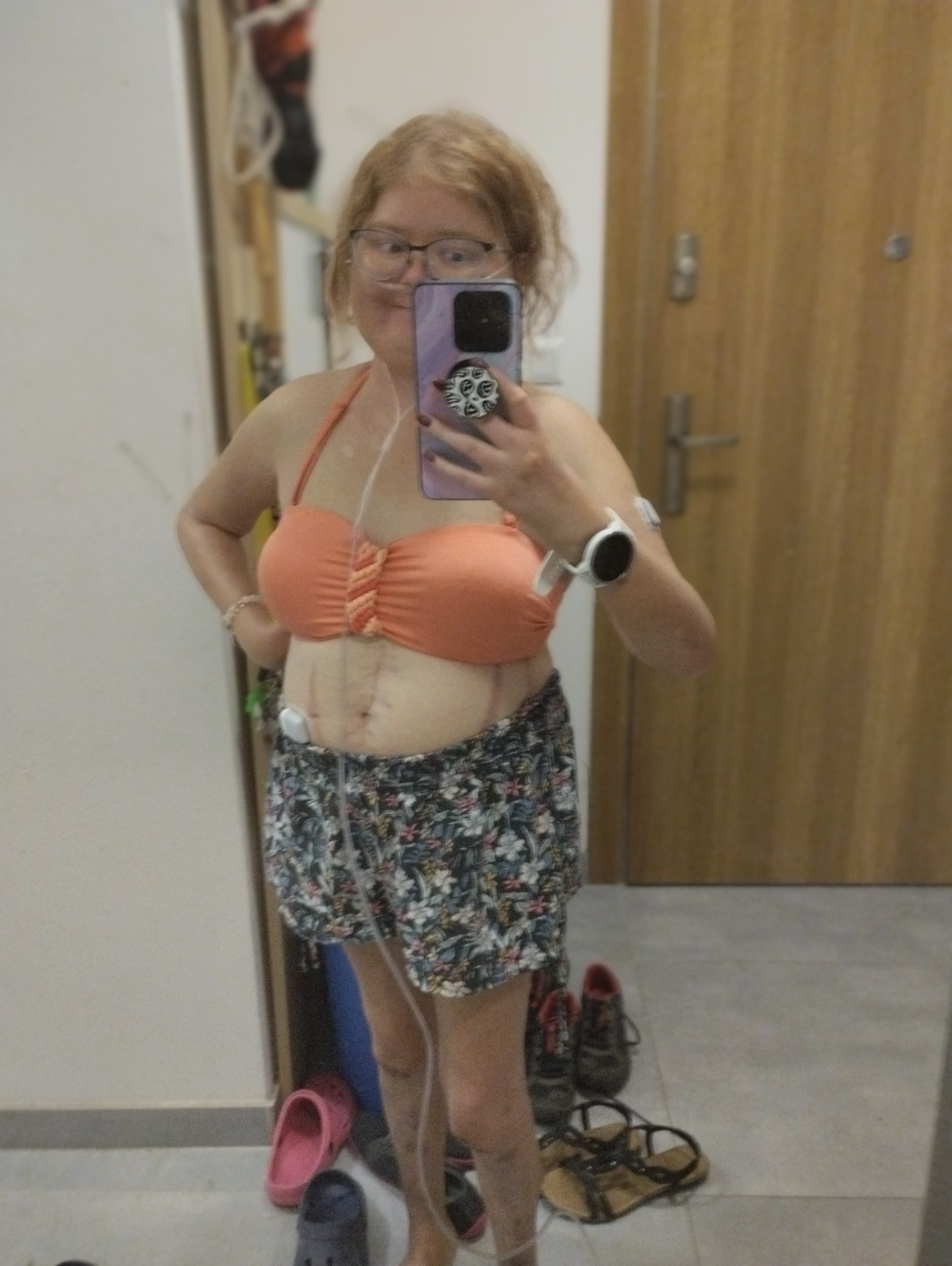 Jenže pak z ničeho nic se všechno toto vytratilo. Důsledkem špatných jaterních testů se mi začalo tvořit akné. Také kortikoidy udělaly své a já začala přibírat. Vůbec se mi tato situace nelíbila. I rodina mi dávala velmi najevo, že vypadám jinak. V tuto chvíli se objevily první strie, které se rozhodly, že už se mnou zůstanou. Během léčby jsem různě přibírala a zase hubla. Nejen že tento proces nebyl moc dobrý pro můj vzhled těla, ale ani psychice moc nepřidal. Spíše naopak. Postupem času se tělo začalo hodně měnit. Třeba tím, že ztrácelo fyzickou kondici. Dříve jsem mohla skákat, běhat a dovádět, nyní jsem ráda, že můžu chodit. Nejdříve přišlo omezení kvůli nedostatku kapacity plic, poté drsný tříměsíční pobyt v nemocnici, díky kterému jsem ztratila opravdu hodně svalové hmoty a následně dostala kyslík. Neminul mě ani mnohokrát zavedený centrální vstup, abych mohla dostávat léčbu